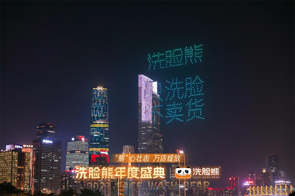 無人機在夜空中依次變幻出“洗臉熊logo”“洗臉熊,只洗臉不賣貨”“男生女生都愛的洗臉品牌”“洗臉熊代言人古天樂”